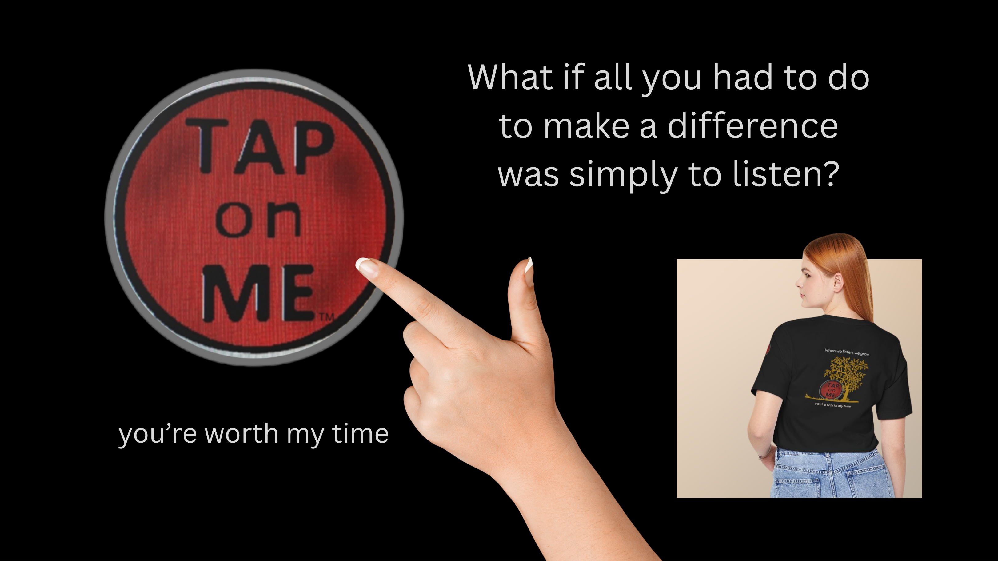 It only takes one compassionate soul and a small amount of time to make another feel valued. Tap on me and I'm here to listen-no bias, no judgement. A brand for anyone who shares the hope of uniting people in a world determined to divide us. There are many different types of people in this world, but there is only one kind. Humankind. Be the approachable type. "When we listen, we grow."